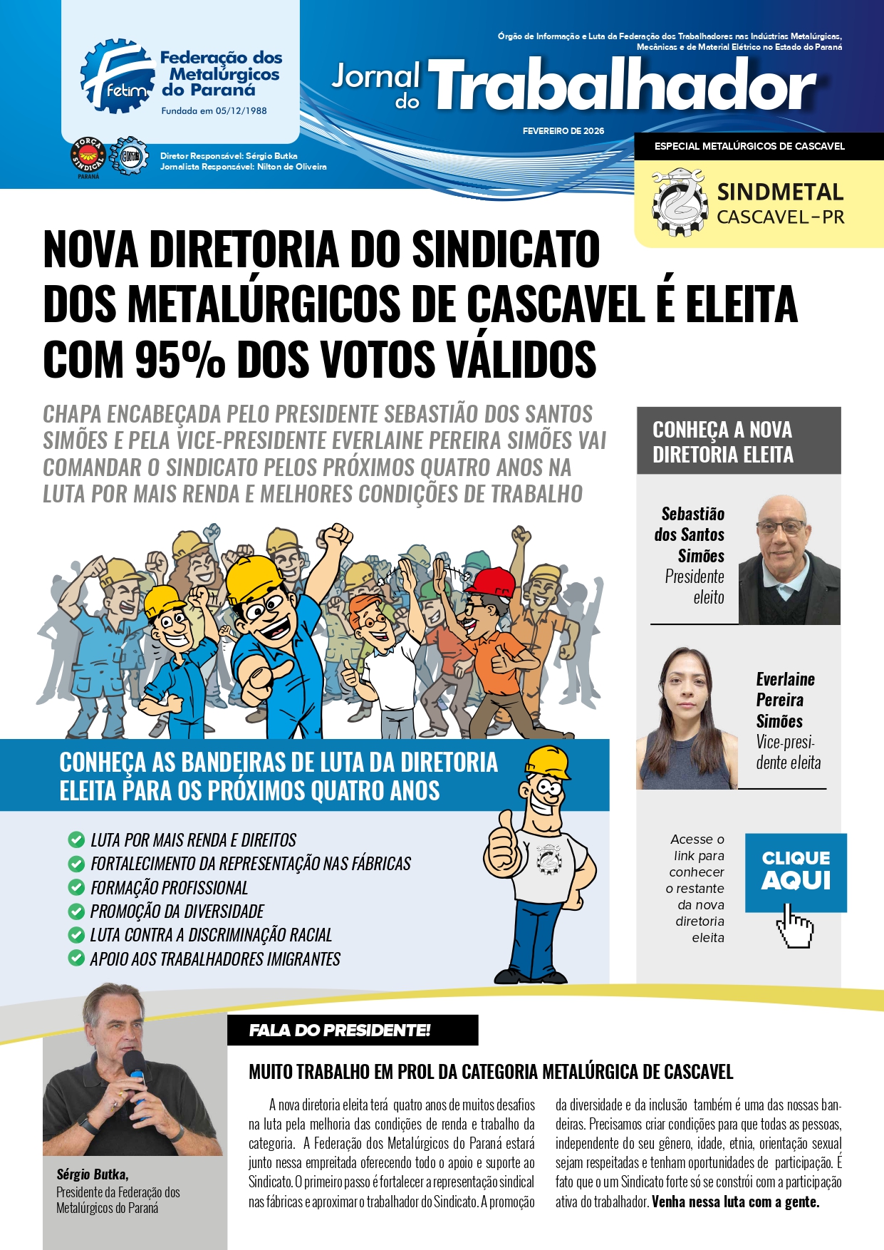 12 fev 2026 NOVA DIRETORIA DO SINDICATO DOS METALÚRGICOS DE CASCAVEL É ELEITA COM 95% DOS VOTOS VÁLIDOS por sindmetalcascavel | postado em: Notícias | 0 CONFIRA: NOVA DIRETORIA DO SINDICATO DOS METALÚRGICOS DE CASCAVEL É ELEITA COM 95% DOS VOTOS VÁLIDOS